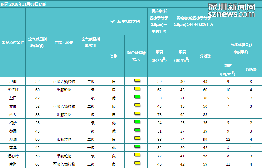 深圳市人居环境委员会于2018年11月8日14时发布空气质量时报