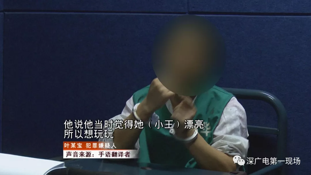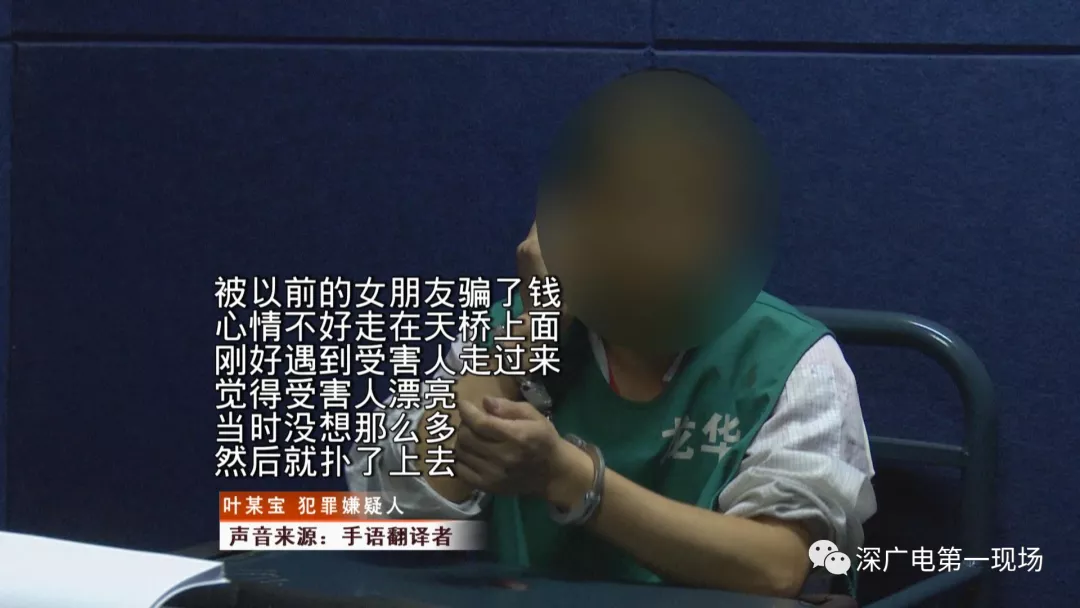 今天上午,记者在龙华油松派出所,见到了犯罪嫌疑人叶某宝。叶某宝是安徽人,今年31岁,在龙华区某工厂工作。在采访时,记者发现,犯罪嫌疑人叶某宝是名听障人士,通过手语交谈后了解到,11月2号晚上七点多,他途经建设东路人行天桥时,对小王起了“歹心”。