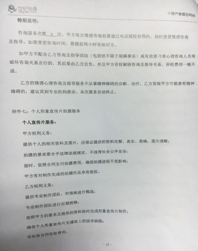深圳新闻网讯 近日,刘小姐向记者反映,她今年与世纪佳缘签订了一份价格为4.88万的红娘服务合同,一名工作人员对她说,可以让她约见60位男士,合同签订后,她才约见8位男士,世纪佳缘就不介绍男士给她相亲了,且实际上终止了服务。刘小姐认为世纪佳缘违反了协议,于是提出退款70%,但被公司断然拒绝。