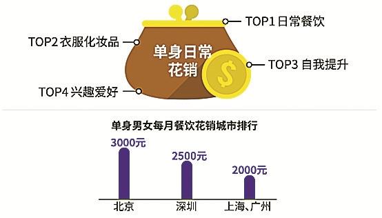 抖音上“成都小甜甜:带我吃饭就好”,打动无数单身男女心。然而数据显示,单身人群每月(除房租房贷外)的生活花费占比最多的就是日常餐饮,占比达40.67%。从地域来看,北京单身每月均餐饮花销为3000左右,深圳为2500元,而上海、广州则在2000元。可见,“吃饭”已经单身男女生活的最大开支之一,想要实现“带我吃饭就好”并非是一件容易的事情。而除餐饮花销外,单身男女其他花销分别为购置衣服化妆品、自我提升费用、兴趣爱好。