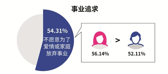 对于许多人而言,爱情和事业冲突的抉择已经越来越常见。调查显示,54.31%的单身男女不愿意为了爱情或家庭放弃自己的事业。从男女差异看,56.14%的女性表示不愿意为了爱情或家庭放弃自己的职场或事业,高于男性。可见,女性对于事业的追求正在逐渐提升。