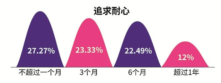 在追求耐心方面,有超七成单身男女追求爱情的时间不超过半年,其中27.27%的单身表示对喜欢的人追求时间不超过一个月,23.33%的人追求时间为3个月,另外有22.49%愿意追求时间为6个月,仅有12%的单身男女追求喜欢的人愿意超过1年。