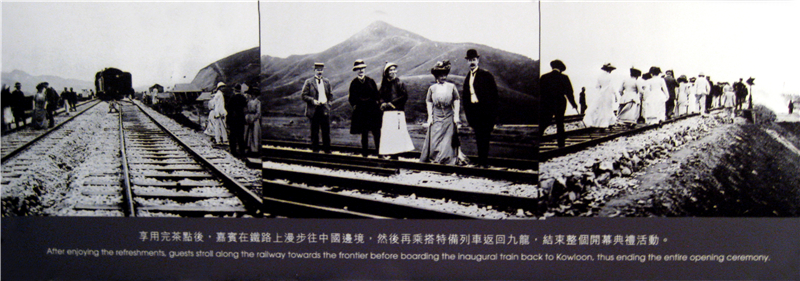 左边第一张图为1911年10月15日九广铁路全线通车现场,右边两张图为参加通车典礼的中英嘉宾的活动场景