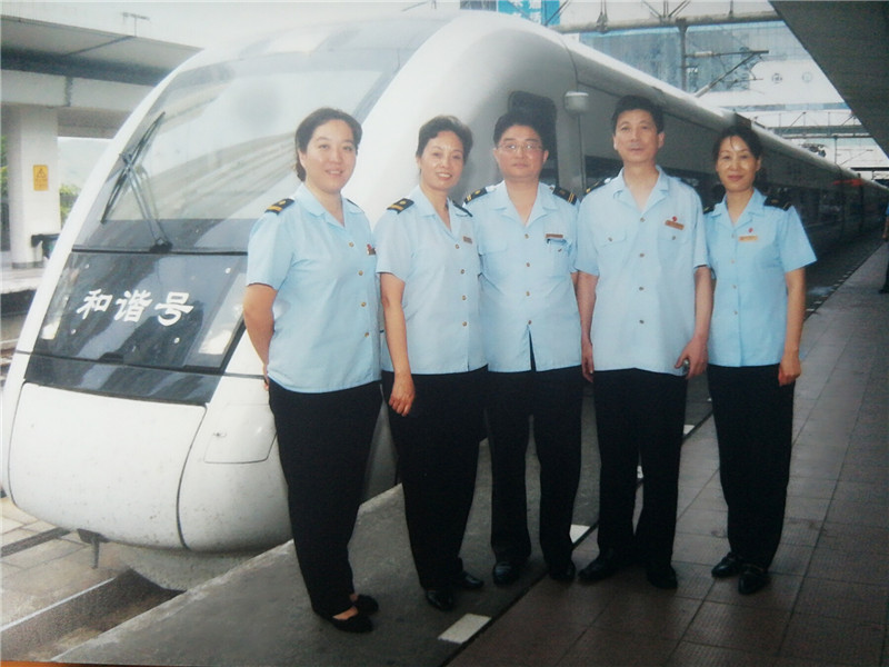 深圳火车站开行第一趟和谐号,叶迎春(右一)和同事在列车前合影