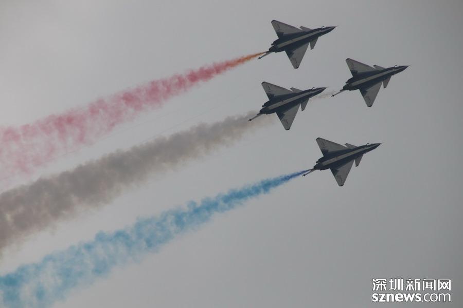 “八一”飞行表演队的队员则驾驶歼-10,展示了单机特技表演、六机编队通场……战机拉着彩烟,为观众带来精彩的空中芭蕾。