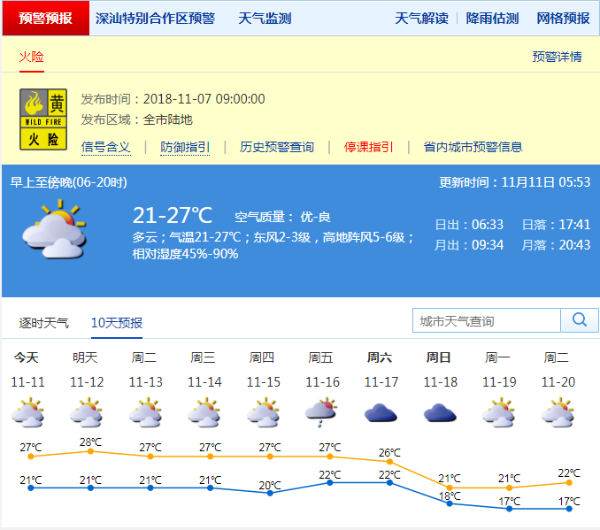 预计早晨7-9时,全市多云间阴天;气温21 ℃ -23 ℃,相对湿度75%-90%,轻微偏东风,能见度3-15公里。深圳市气象台2018年11月11日06:01发布。