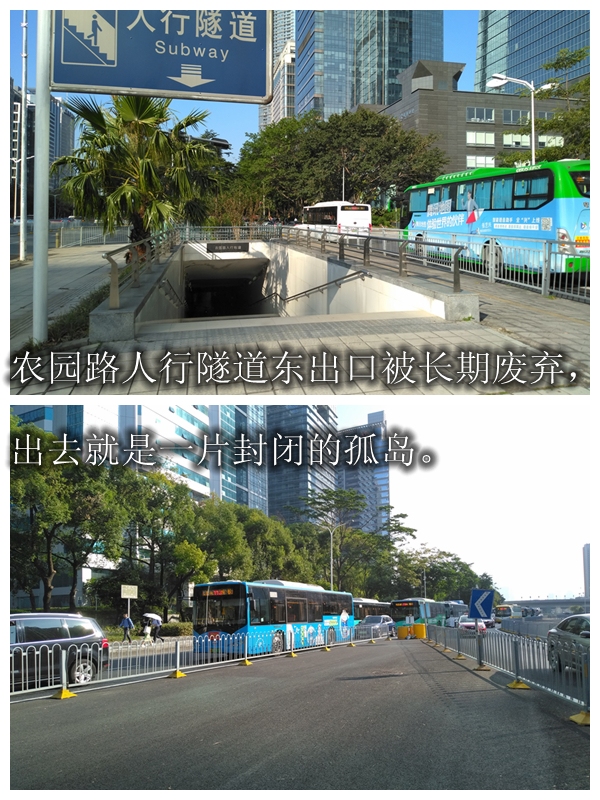 自2017年连通深南大道两侧,可供行人通行的人行天桥被拆卸后,行人都只能从人行隧道过街。但奇怪的是,人行隧道的东出口处是一片被隔离、被荒废的“孤岛”,这让需要从此出口通行的市民很尴尬。即使避开这个出口,选择绕行,又容易在农园路口与右转车辆发生冲突。“真的很为难我们啊。”市民吴先生证实了步行通过该路段的“艰难”。