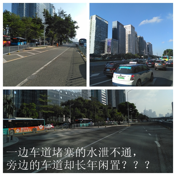 一边是拥堵不堪的狭小道路,一边是长年闲置的车道,网友在公交车上看着旁边空空如也的马路,手表走过该打卡的点,他又迟到了。