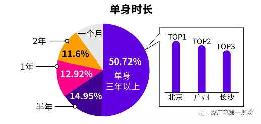 针对单身时长的调查发现,有高达50.72%的人为单身三年以上的“长单族”,“长单族”占比最多的城市前三为北京、广州和长沙。