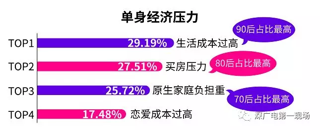 脱单难点中的经济压力层面分析发现,生活成本过高是影响脱单的最大单身压力,其次是买房压力,原生家庭负担重以及恋爱成本过高。