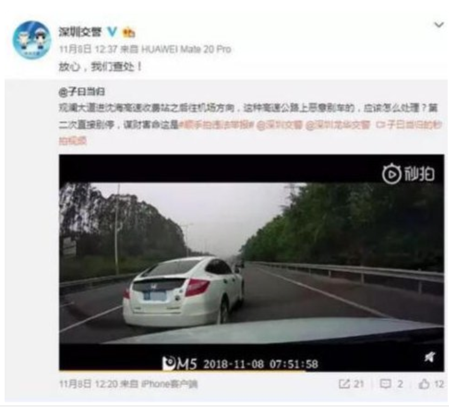 近日,深圳交警接到举报称:一公交大巴存在故意斗气的情况,多次别停后方出租车。接到举报后,交警立即展开调查,调取双方车辆行车记录仪发现,前车公交大巴从站台驶出,因没有及时避让后方出租车,导致的士司机狂按喇叭,紧接着公交大巴开始呈 S型路线行驶,先右后左别停后方出租车三次!