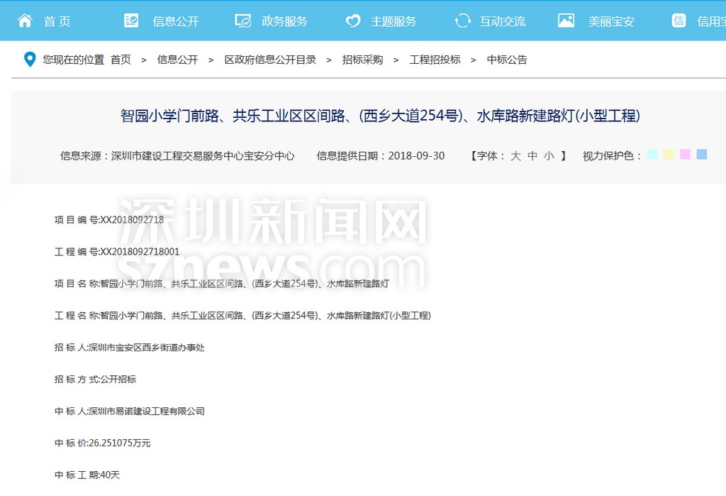 针对网友反映的情况,记者查阅相关资料发现,宝安智园小学门前的施工工程于2018年9月28日公开招标。