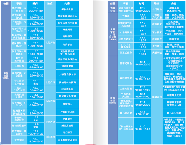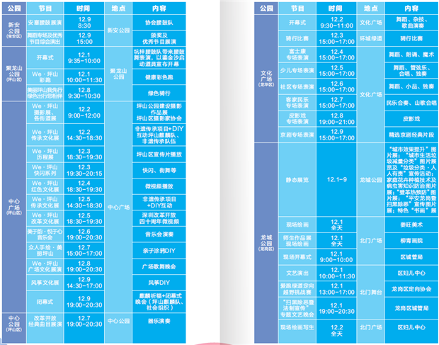 据了解,本次公园文化季各区将继续瑞出丰富多彩的活动和节目。例如,福田区香蜜公园将举行第二届集体婚礼;盐田区内湖公园动静结合,静态推出珊瑚海洋科普展,动态推出极限运动专场演出;龙岗区龙城公园策划了爱跑绿道定向越野挑战赛,推广全民健身;龙华区文化广场多场专场表演,舞蹈、魔术、器乐演奏等轮番上演等等。