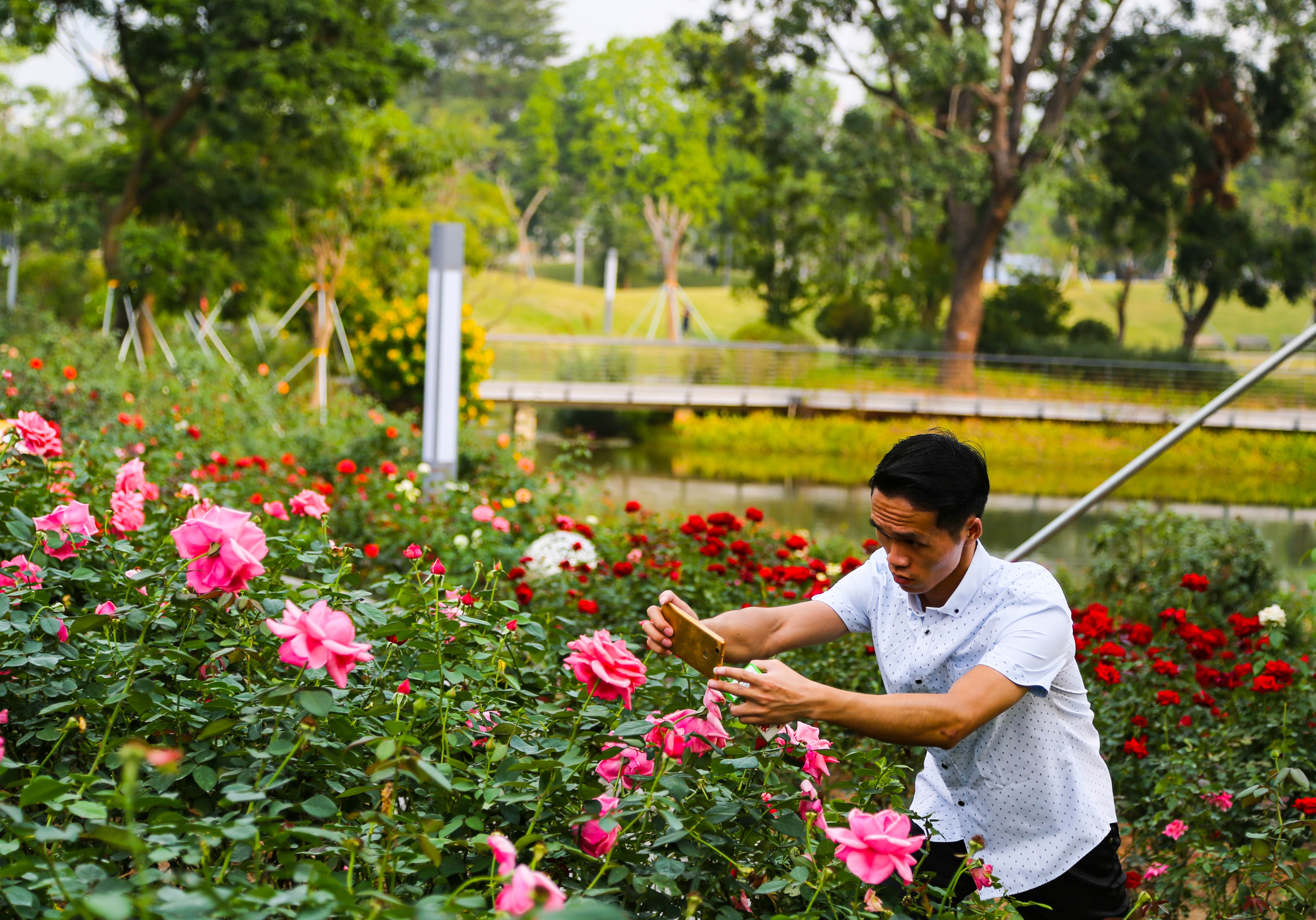 在婚姻登记处和礼堂的北侧是一大片的玫瑰花海,最近天气晴好,正是鲜花怒放的时候,不少市民在在参观完装修中的礼堂之后,选择在花海里自拍,一位市民甚至把落下的花瓣拾起,装了满满两袋,用花瓣在地上摆成“智慧”等汉字字样。