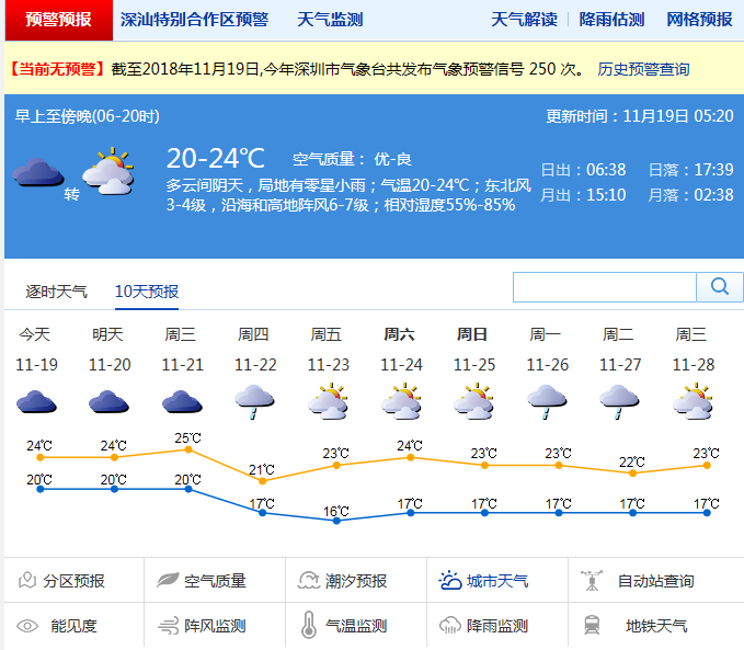记者从深圳市气象局了解到,18日西路冷空气+切变线从粤北缓慢南压下来,短暂时间可见阳光,沿海气温较高,在28°C-30°C左右,今天傍晚开始随着冷空气离深圳市越来越近,云层加厚,转阴天有小雨,气温在20°C-25°C左右,体感稍凉。下一波冷空气将于22日左右来,一次比一次凉,买的厚衣服可以拿出来美了!