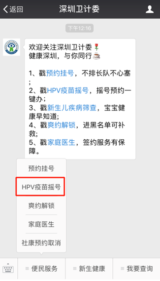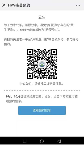 11月19日,深圳卫计委上线了九价HPV疫苗摇号系统,“深圳卫计委”微信公众号为官方认证的唯一摇号平台。进入“深圳卫计委”-菜单栏“便民服务”-“HPV疫苗摇号”系统,可以一站式“注册-摇号-预约”。