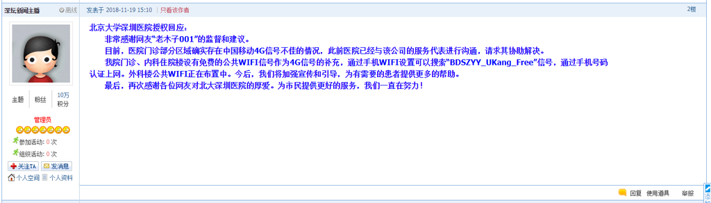 “我院门诊、内科住院楼设有免费的公共WIFI信号作为4G信号的补充,通过手机WIFI设置可以搜索‘BDSZYY_UKang_Free’信号,通过手机号码认证上网。外科楼公共WIFI正在布置中。”北大深圳医院回应称。北大深圳医院同时表示,关于医院门诊部分区域存在中国移动4G信号不佳的情况,医院已经与中国移动的服务代表进行沟通,请求协助解决,下来也会加强宣传和引导,为有需要的患者提供的帮助。