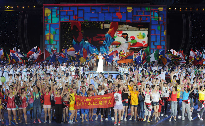 2011年8月23日,第26届世界大学生夏季运动会闭幕式在深圳举行。这是闭幕式上打出的“我们永远是朋友”的横幅。