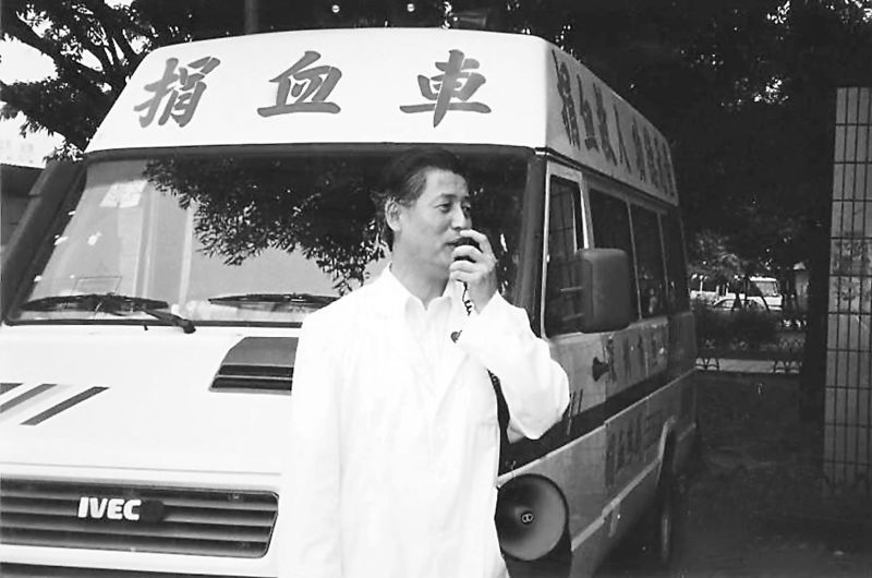 1995年5月7日,捐血车第一天开上街头,血站老站长杨春森拿着扩音器大嗽叭向市民宣传。 余海蓉 摄