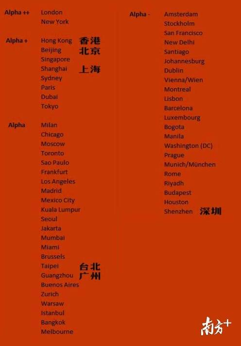 其它的中国城市,香港、北京、上海位于第二档Alpha+级,分别位于全球3、4、6位,该级共有8个城市;台北、广州位于第三档Alpha级,分别位于全球26、27位,该级共有23个城市。