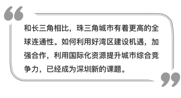 一方面,深圳要开展更大范围、更高水平、更深层次的全球合作,提升在全球网络中的地位和能级,增强对经济资源要素的配置能力,加深与全球市场的融合程度。另一方面,深圳也应从本土优势和特色出发,进一步融入国家开放格局,构筑良性的城市-腹地关系,培育内生的经济、产业、设施、资源等支撑体系,通过区域协同发展,增强全球竞争力。