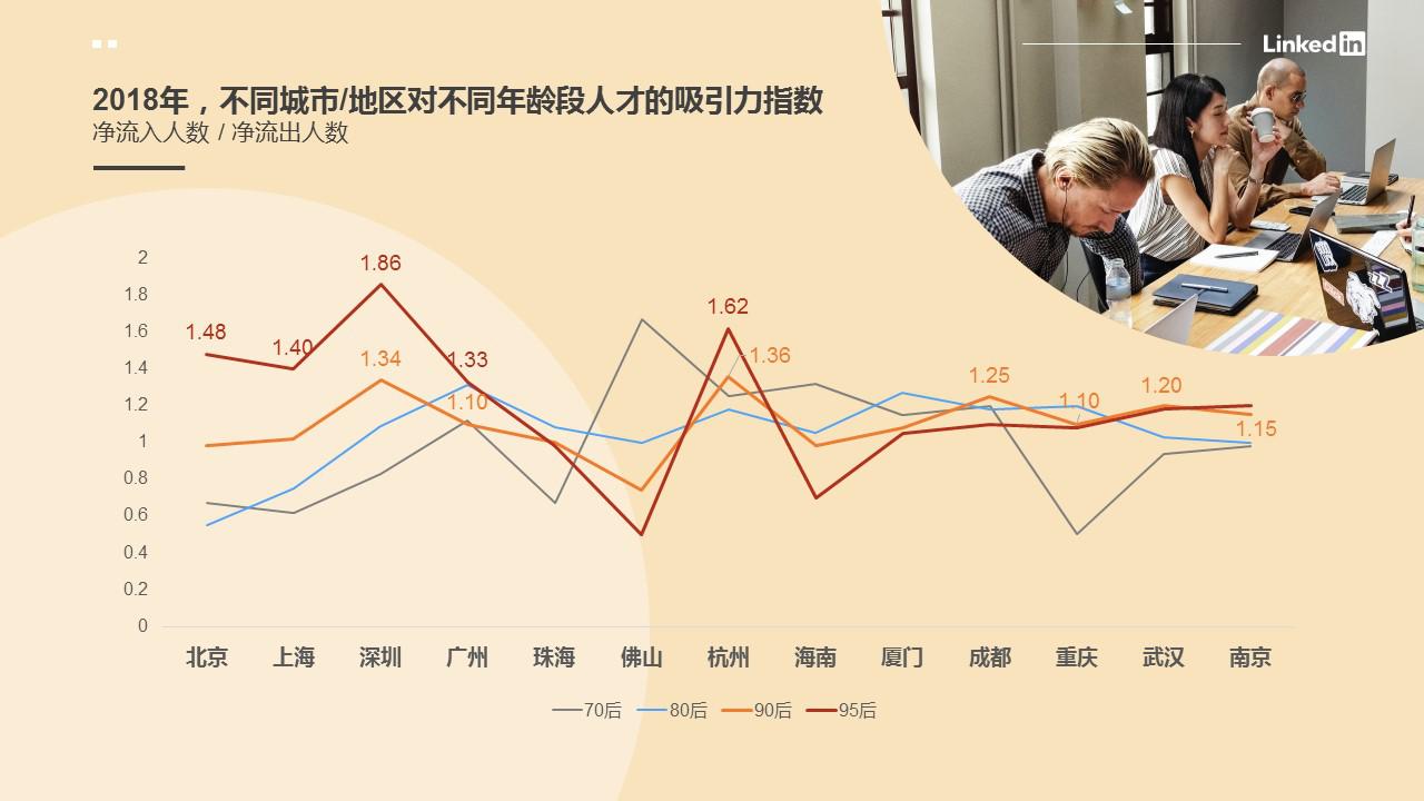 通过对比不同城市及地区的人才吸引力指数(净流入人数/净流出人数),领英数据显示:对于新毕业的95后年轻人来说一线城市仍是毕业后职场起步的首选。