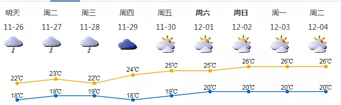 25日多云转阴天,傍晚前后有零星小雨,早晚清凉,19-24℃;26-28日天空云量较多,间中有小雨,雨时能见度稍低;29日起多云,可见阳光。近期干燥少雨,降雨来临前仍需做好防火安全管理。