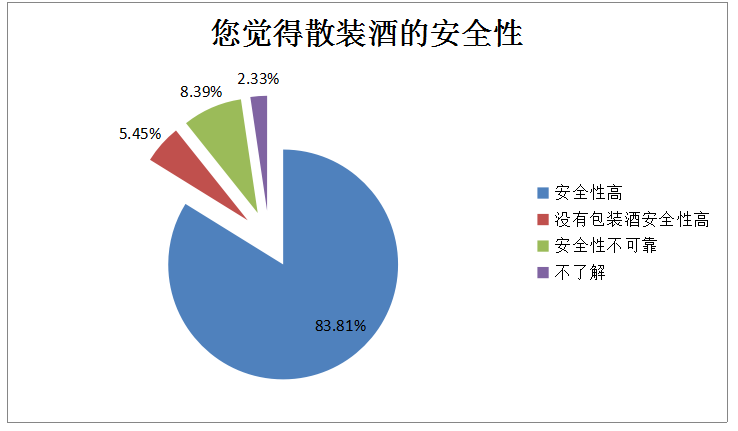 深圳人对散装酒安全性的评价如何?83.81%的网民还是认为安全性高;只有8.39%的网民和5.45%的网民认为安全性不可靠、没有包装酒安全性高。