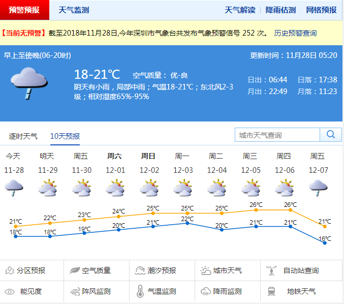 深圳新闻网11月28日讯(记者 陈婕)深圳的平均入秋日是11月3号,而今年是11月22日,属历史第二晚。既然入了秋,就要有秋天的样子,在这种太阳休年假的时候,气温是很难升高的,不过我知道你们也不想要升温,12月中旬的那波冷空气可能会让你更满意。目前雷达回波还主要在海上,秋雨绵绵,预计28日还会有一些零散回波“飘”过来,以分散性的小雨为主。