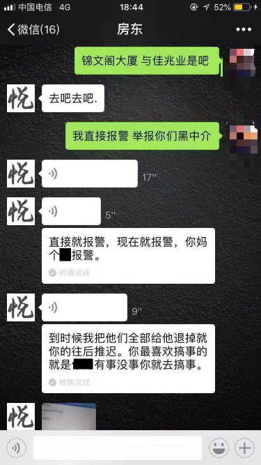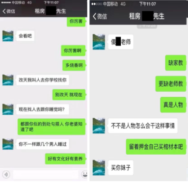 追索押金的过程并不平静。10月13号的一次微信沟通中,余某亮对李小姐以文字和色情图片进行人身恐吓、辱骂和性骚扰。记者还获悉,余某亮至少对2人女租客进行过性骚扰,也有男租客称受到余某亮等人的人身恐吓。
