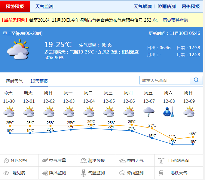 深圳新闻网11月30日讯(记者 施冰冰)29日多云间晴天;18-25℃;东风2-3级;湿度50%-90%。12月1-2日多云可见阳光,早晚有轻雾;3-6日多云间阴天,偶有零星小雨。展望7-8日,受冷空气影响,北风明显增大,天气转冷。