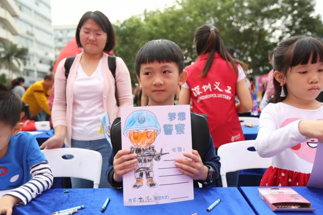 最具童年味道和勃勃生机,大人和小孩现场涂鸦,写出对警察想说的话,也可以在画架画板上画出自己心目中的警察,在孩子心中种下警察的种子,满满的寄语,是对福田警察的祝福和期待,这也是警察蜀黍肩膀上沉甸甸的责任和勇往直前的力量!