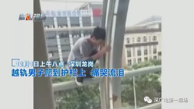 市民拍摄的画面显示,男子一度爬到护栏上,并蹲靠着护栏痛哭。
