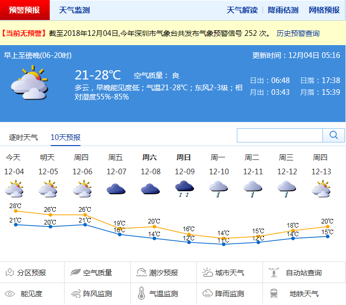 深圳新闻网12月4日讯(记者 刘婷)记者从市气象台获悉,预计今日多云,午后云量增多,早晚有轻雾,气温21℃至28℃;5日至6日阴天间多云,间有零星小雨。预计7日起冷空气活动频繁,北风加大,7日至8日阴天有分散小雨,气温下降,最低气温或低至14℃。