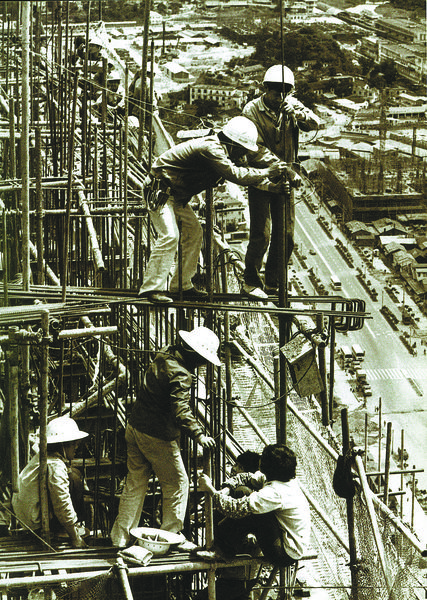 1984年,创造“三天一层楼”的“深圳速度”的国贸大厦工人。江式高 摄