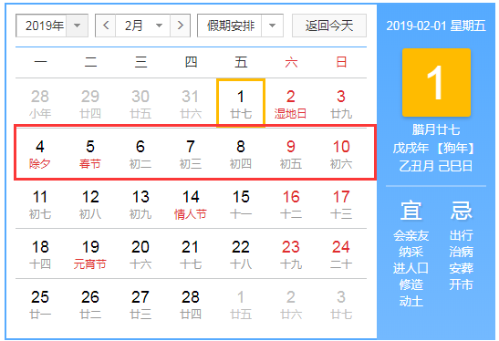 2019年春节是2月5日(星期二),根据规定春节法定放假时间是初一到初六,调休7天。2019年2月2日、2月3日需上班调休。