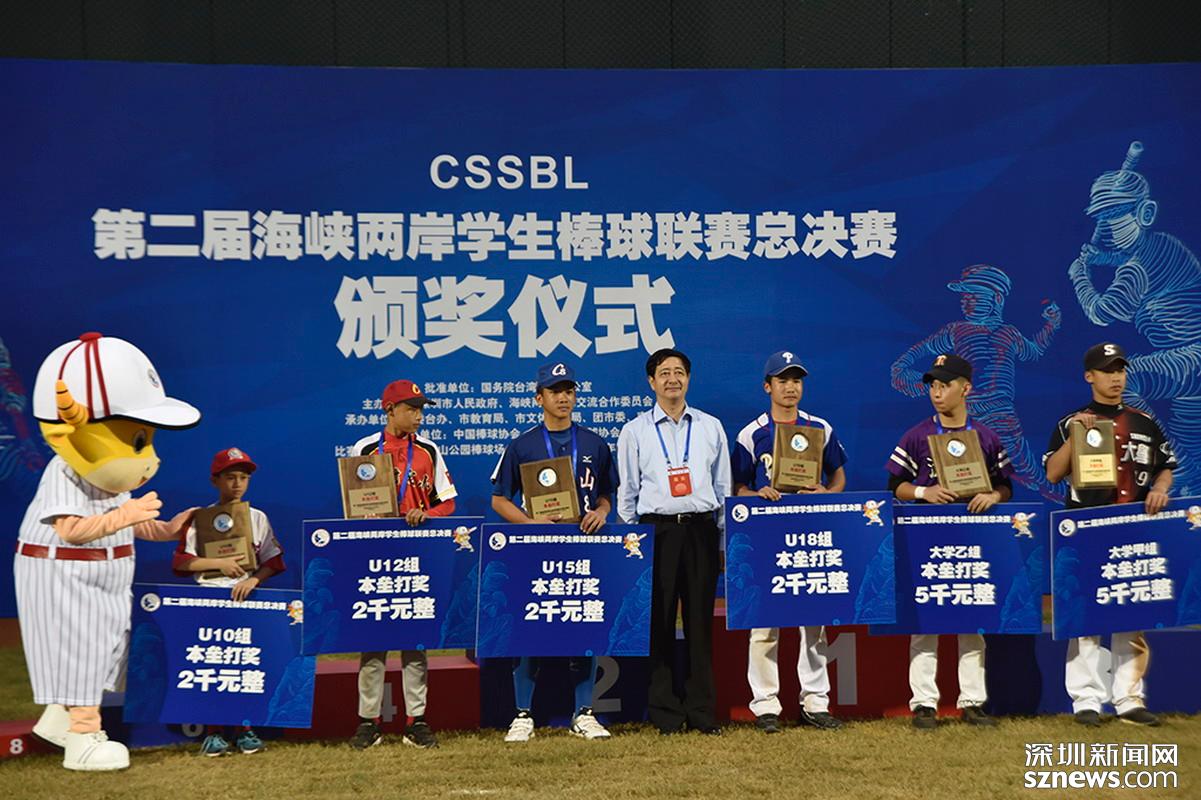 深圳新闻网12月6日讯(记者 陈婕  杨浩瀚)12月5日,第二届海峡两岸学生棒球联赛总决赛闭幕式在深圳市中山公园棒球场举行。经过四天激烈角逐,北方工业大学、台湾清华大学分别获得大学甲组、大学乙组冠军;台东大学附属体育高级中学、北京市大成学校、无锡梅村实验小学、桃园中平小学分别获得U18组、U15组、U12组、U10组第一名。