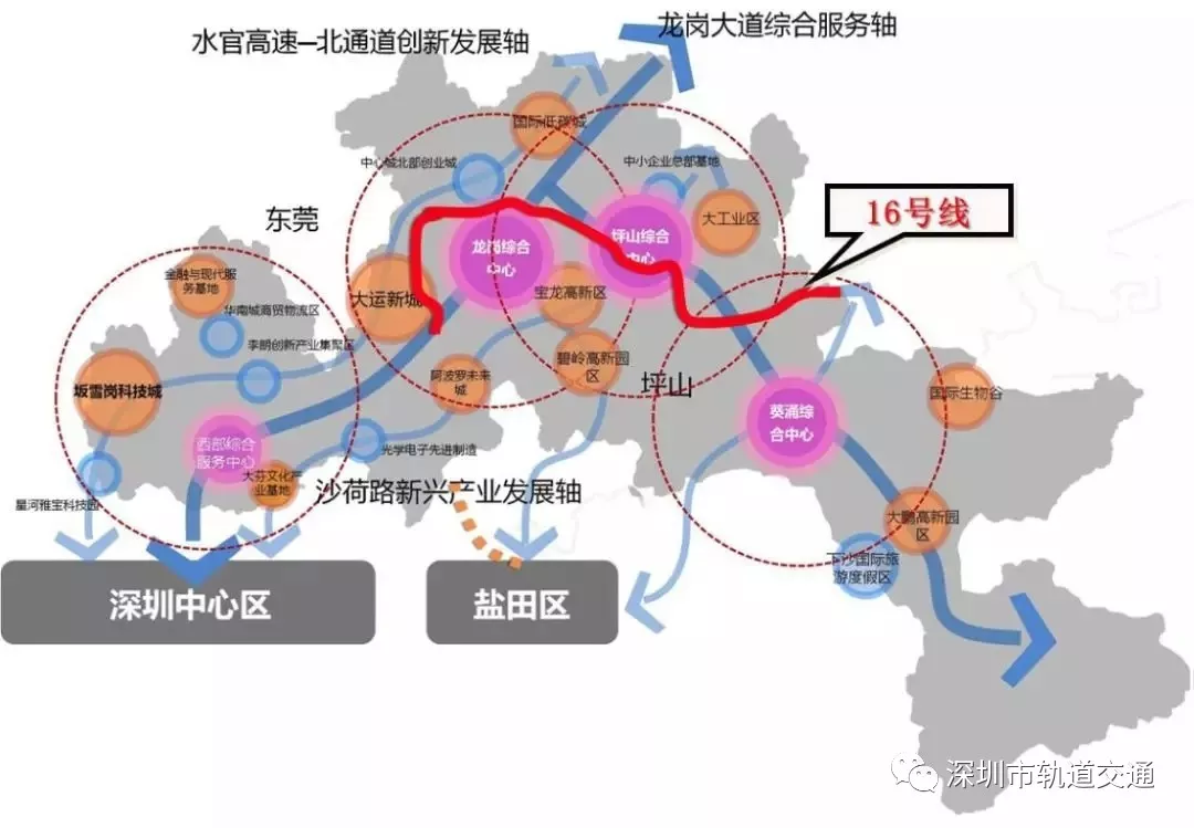 深圳地铁16号线联系大运新城、龙岗中心城、坪山站及坪山新区等地区,是东部组团内部的轨道线路。线路全长约29.2公里,设站24座。线路由大运站引出,沿龙岗大道、黄阁路、龙平路敷设,经龙岗老中心后沿深汕公路往南至坪山站,经坪山中心区后沿东纵路、金田路等路敷设至终点田心。