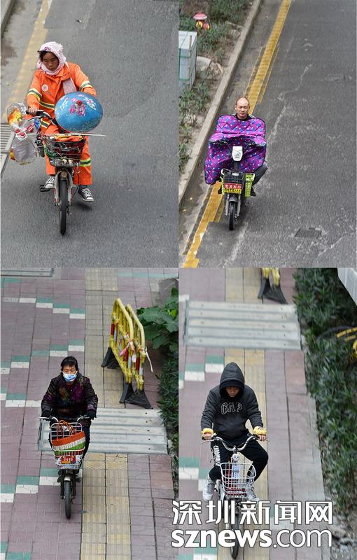 气温骤降,骑行更觉寒冷,往来骑车的市民使用各种保暖措施御寒。