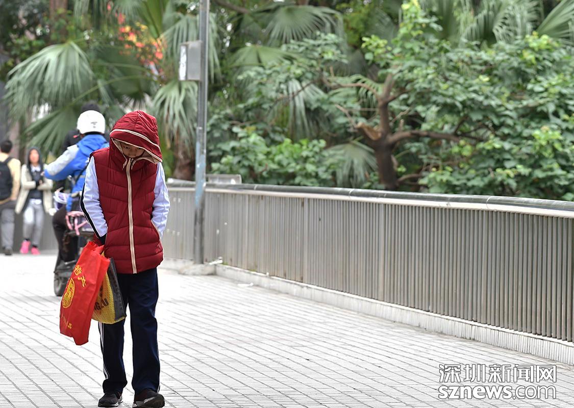 2018年12月12日,罗湖翠竹天桥,老人穿着羽绒服出行。