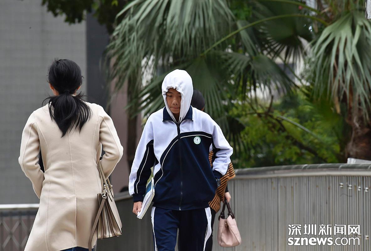 2018年12月12日,罗湖翠竹天桥,穿着校服的少年带上帽子御寒。