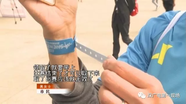 今天中午,已经有不少要参与本次马拉松比赛的市民,前往市民中心广场领取号码簿和参赛包。吴女士今年是第一次参加马拉松全程的比赛。在领取的物品中,有一个蓝色手环比较特别。