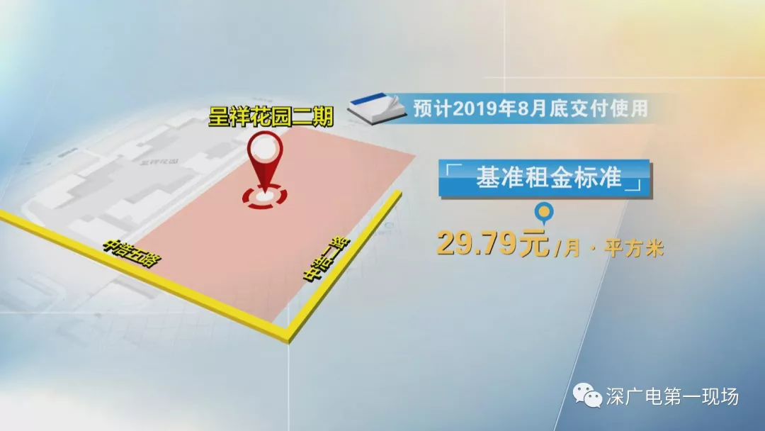 呈祥花园二期位于龙岗区坂田街道,中浩二路与中浩五路的交接处,预计2019年8月底交付使用。项目共有5栋住房,基准租金标准暂定为每月每平方米29块7毛9。