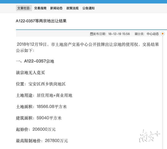 记者12月19日查阅深圳市土地房产交易中心官网信息显示,A122—0357宗地出让结果为无人竞买。