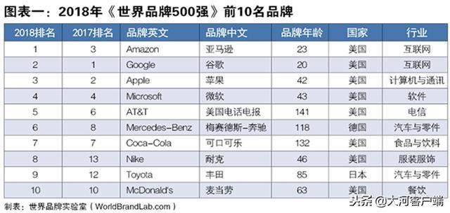 由世界品牌实验室(World Brand Lab)独家编制的2018年度(第十五届)《世界品牌500强》排行榜于12月18日在美国纽约揭晓。得益于人工智能和大数据技术,去年的季军亚马逊(Amazon)一举击败苹果(Apple)荣登榜首,其第三季度营业利润创10年新高;谷歌(Google)承袭科技优势,在无人驾驶领域成绩突出,位列第二;苹果(Apple)退居第三。美国占据500强中的223席,稳居品牌大国第一。中国入选的品牌只有38个,与经济第二大国的地位并不匹配。其中表现亮眼的品牌有国家电网、腾讯、海尔、华为、青岛啤酒、中化、五粮液、中国国航。