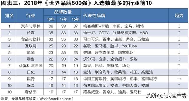今年《世界品牌500强》共覆盖了57个行业。其中,汽车与零件行业共有36个品牌入榜,排名继续保持第一;传媒行业今年上榜了35个品牌,位居行业第二;食品与饮料行业继续下滑,以33个品牌退居第三;互联网行业继续保持上涨的势头,以25个品牌超过能源行业(23个)排名第四。零售(22个)以及计算机与通讯(20个)行业均有小幅上涨。在过去的一年中,全球互联网市场继续保持高速增幅,2017年底全球互联网用户接近38亿。但是互联网行业的发展并非一帆风顺,今年三月,美国脸书公司陷入数据泄漏丑闻,引发了全互联网行业公司的信任危机,消费者开始注意到保护数据隐私的重要性。