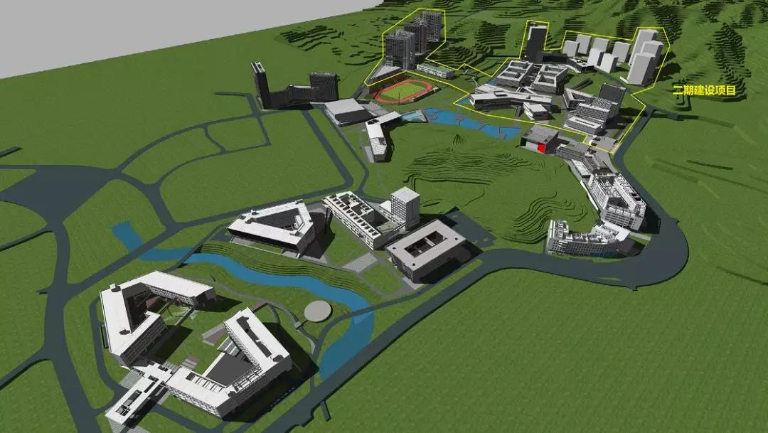 二期工程总建筑面积约44万平方米,其中地上建筑面积约27.5万平方米,地下建筑面积约16.5万平方米,主要建设内容包括中央图书馆综合楼、法商学部、行政办公与专职科研用房、公共教学楼、北区宿舍、食堂及留学生生活用房共16栋建筑。