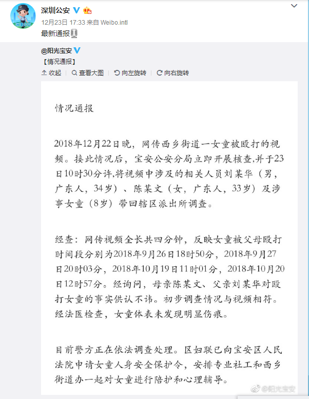 8岁女童遭家暴事件最新消息是,深圳警方对此展开了调查处理。宝安区妇联已向宝安区人民法院申请女童人身安全保护令。宝安公安局的调查结果显示,网上流传的3分钟视频分别是今年9月、10月的四个时间段拍摄,女童父母对殴打女儿的事实供认不讳,法医检查女童体表未发现明显伤痕。