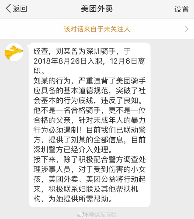 美团确认殴打8岁女童的男子刘某曾是美团骑手,并提供刘某全部信息予警方