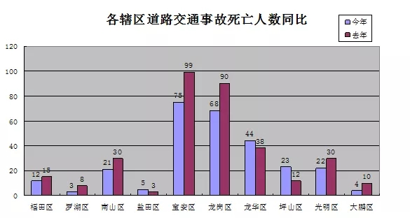 今年以来,在全市各行政区(新区)中,实现道路交通事故死亡人数下降的有7个区。其中宝安区事故死亡人数减少24人,龙岗区事故死亡人数减少22人,这两个我市传统的事故多发区事故死亡人数下降数占全市事故死亡人数下降总人数的79.31%。